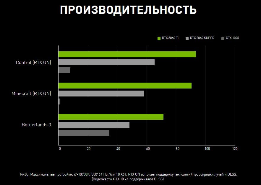 Базовая частота GeForce RTX 3060 составит 1,32 ГГц, а с ускорением – 1,78 ГГц. К тому же энергопотребление 170 Вт.