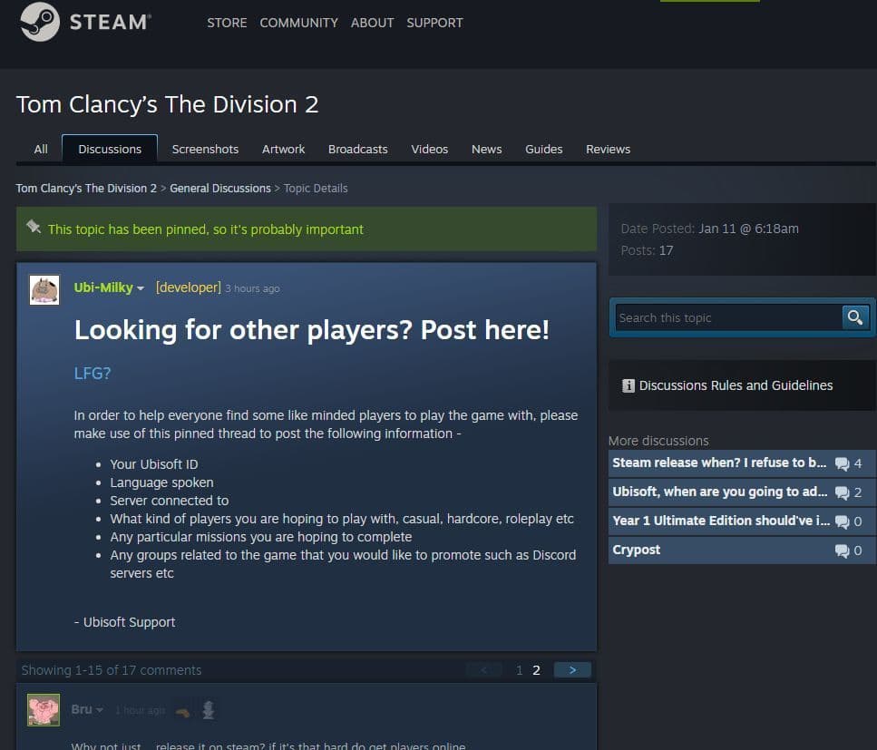 За начинание ответственен Ubi-Milky, создавший тему, в которой Steam-пользователи искали игроков Tom Clancy's The Division 2. Фанатам не понравился тот факт, что платформа использовалась для продвижения продукта на ней недоступного, поэтому после серии критических комментариев пост удалили. Однако в Интернете ничего не теряется.