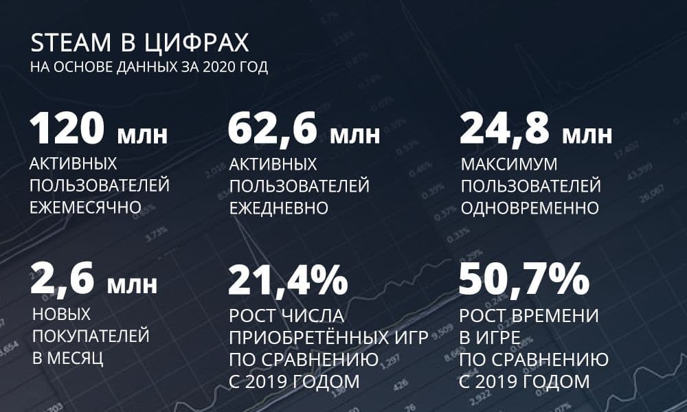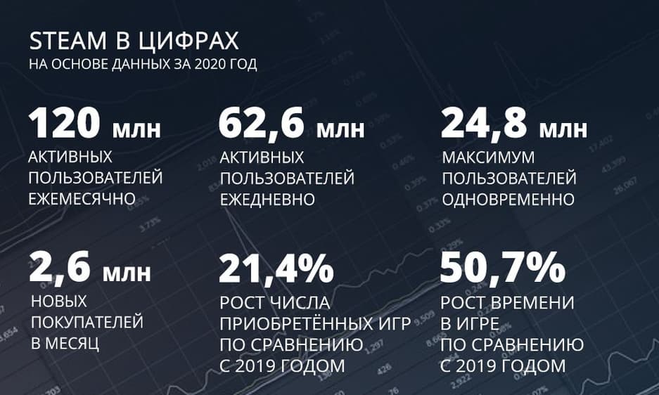 «Это привело к новым рекордам по числу активных пользователей за месяц (120,4 млн.), активных пользователей за день (62,6 млн.), максимуму пользователей одновременно (24,8 млн.), числу новых покупателей (2,6 млн. в месяц), времени в игре (31,3 млрд. часов) и приобретённых игр (рост на 21,4% по сравнению с 2019 годом)», - говорится в заявлении Valve.