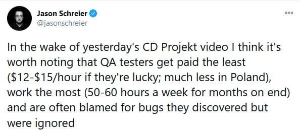 Джейсон Шрейер напомнил, что тестировщики получают сравнительно мало по меркам игровой индустрии (12-15 долларов в час, а в Польше значительно меньше), работают по 50-60 часов в неделю. При этом тестировщиков «часто обвиняют в багах, которые они нашли, но были проигнорированы».