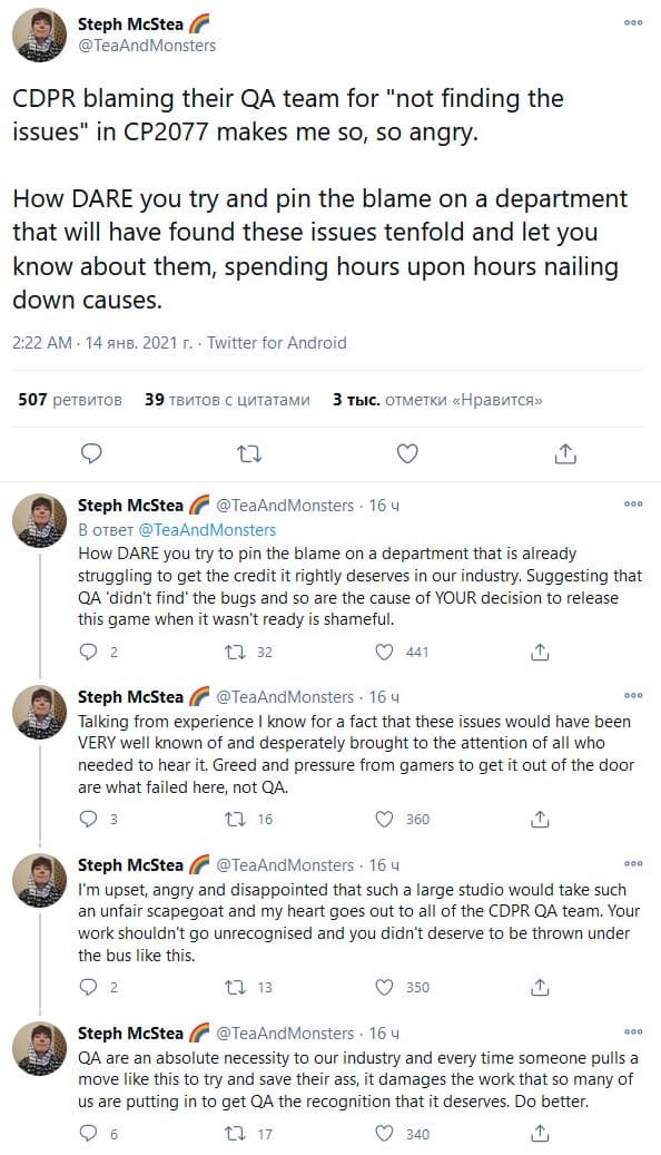 «CD Projekt Red обвиняет свою команду тестировников в том, что “она не обнаружила проблемы” в Cyberpunk 2077. Как вы смеете пытаться свалить вину на отдел, который бы десять раз нашёл эти проблемы и сообщал бы вам об этом, потратив много часов на их выявление. Как вы смеете пытаться свалить вину на отдел, который и так не получает должного признания в нашей индустрии. Должно быть стыдно, делать предположения о том, что отдел тестировщиков “не нашёл” баги, и это стало причиной вашего решения выпустить неготовую игру. Если судить по моему опыту, то я уверена, что о проблемах было бы хорошо известно, и о проблемах сообщали бы куда следует. Жадность и давление со стороны игроков, чтобы выпустить игру поскорее – вот кто провалился, а не тестировщики», - сказала МакСти.