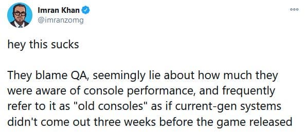 «Это отстой. Они винят тестировшиков, но, похоже, лгут о том, насколько они были осведомлены о производительности на консолях. Ещё они часто упоминают “старые консоли”, хотя консоли текущего поколения вышли за три недели до релиза игры», - отметил Хан.