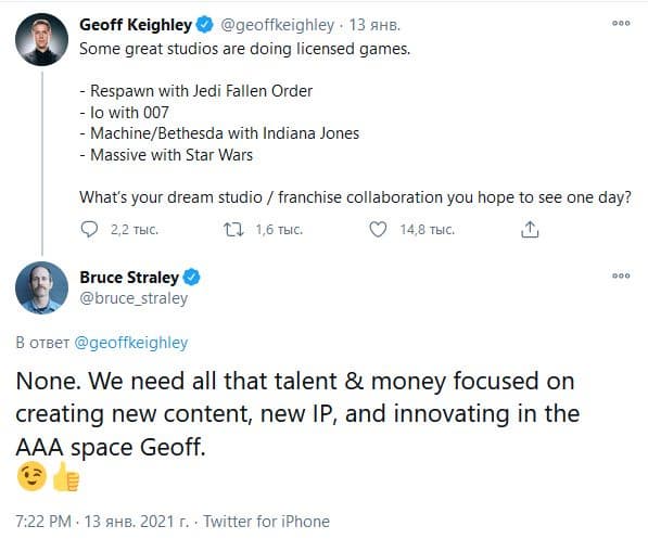 «Нужно, чтобы весь талант и деньги были сконцентрированы на создании нового контента, проектов по новой интеллектуальной собственности и инновациях в ААА-индустрии, Джефф», - сказал Стрейли.