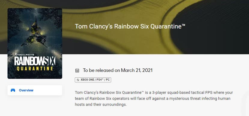 На посвящённой игре Rainbow Six Quarantine странице платформы Ubisoft Connect размещена дата выхода игры – 21 марта 2021 года.