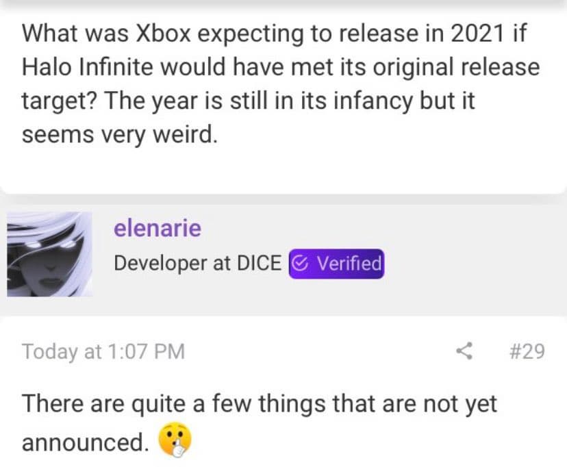 Об этом свидетельствует сообщение на форуме ResetEra (со ссылкой на упомянутую выше статью о Xbox) от разработчицы elenarie, работающей в шведской команде DICE, принадлежащей Electronic Arts. Она сообщила, что у Microsoft есть ещё несколько вещей, которые пока не анонсированы.