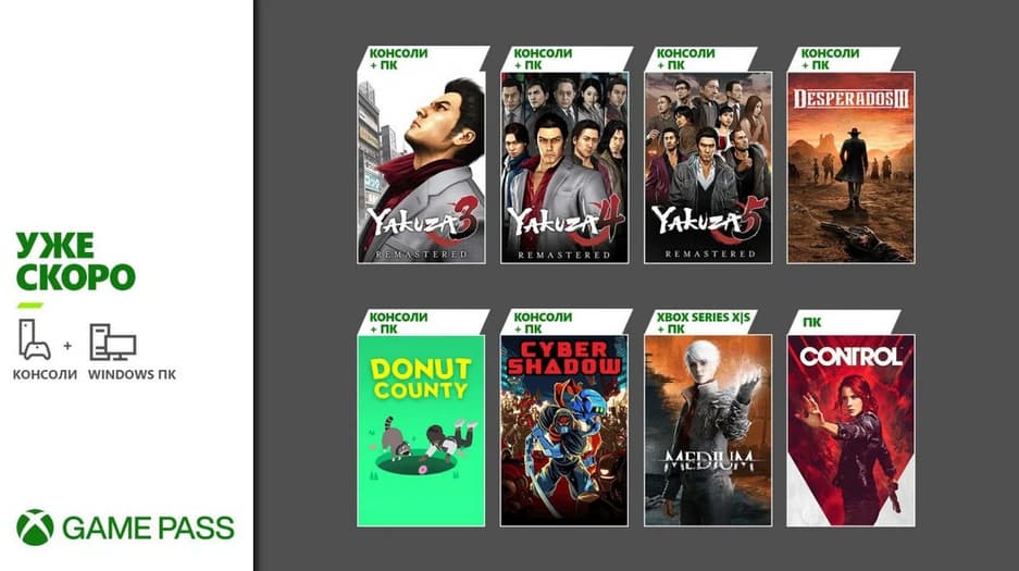 28 января библиотеку сервиса на РС и Xbox Series X|S пополнит психологический триллер The Medium. Кроме того, 28 января на ПК и консолях в Xbox Game Pass выйдет сборник Yakuza Remastered Collection (Yakuza 3 Remastered, Yakuza 4 Remastered и Yakuza 5 Remastered).
