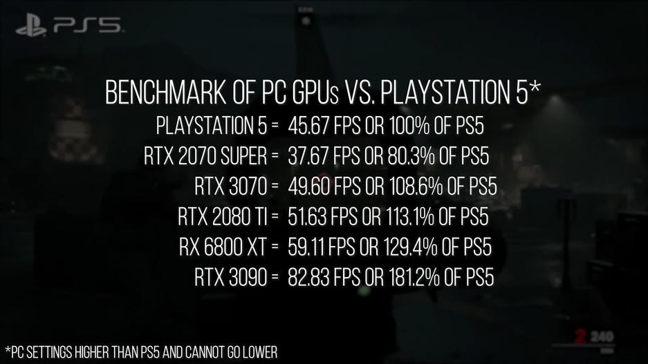 Digital Foundry резюмирует, что в целом PlayStation 5 находится где-то посередине между RTX 2070 и RTX 3070. Однако из-за многочисленных конфигураций и прочих настроек, результаты могут сильно разниться.