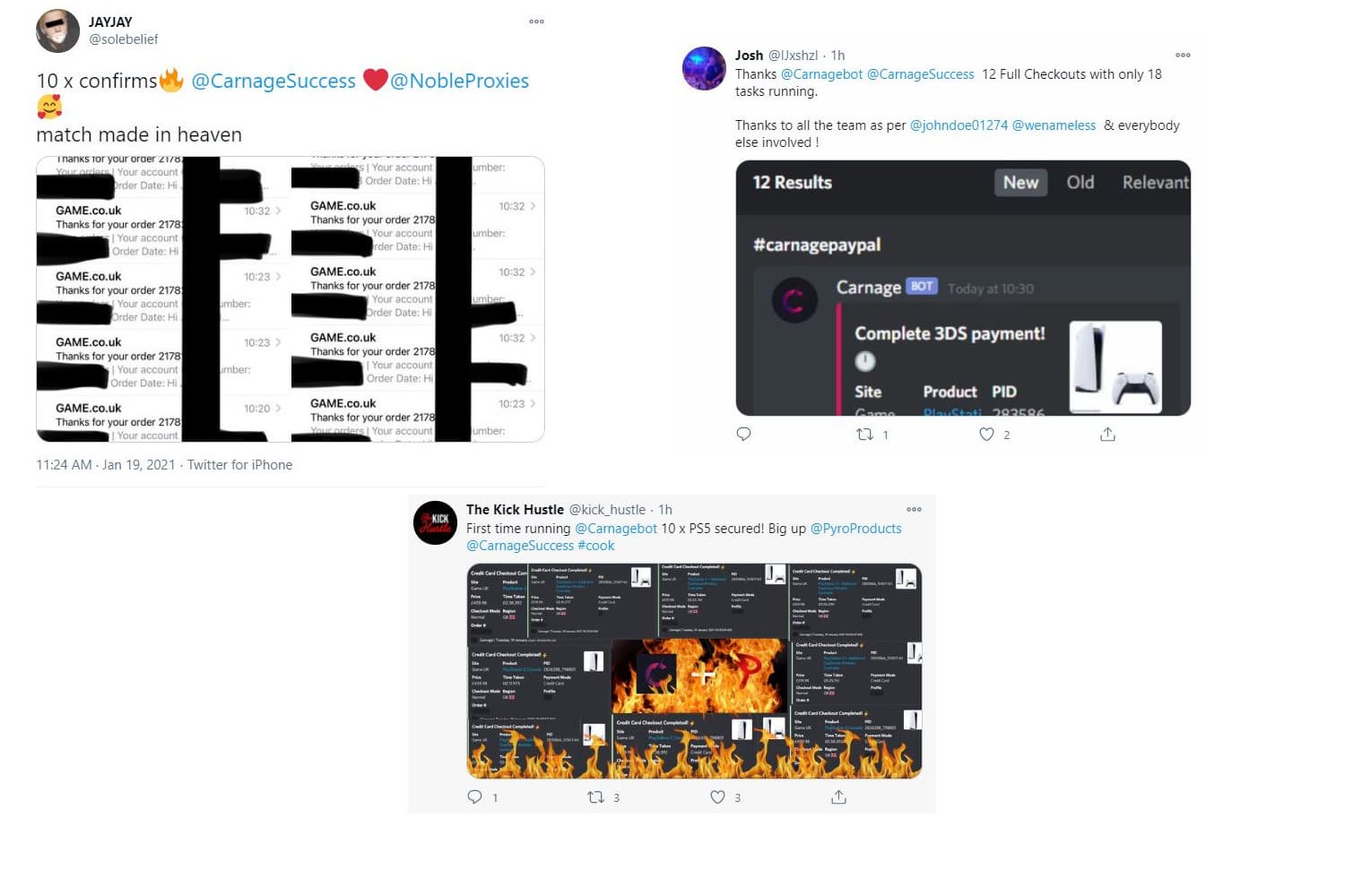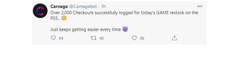 Бот Carnage помогает в массовой скупке продуктов, доступных ограниченным тиражом. Разработчики приложения сообщили в Twitter, что людям с помощью «инструмента» удалось получить более двух тысяч устройств Sony. Сообщение раскритиковали, и авторы программы изменили настройки профиля на непубличный.