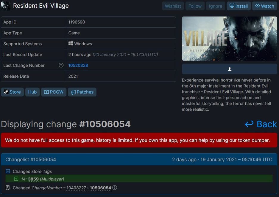 Не исключено, что хоррор Resident Evil Village включает в себя не только сюжетную кампанию, но и мультиплеер. Упоминание о мультиплеере появилось на странице игры в сервисе SteamDB, который отслеживает информацию о проектах из Steam.