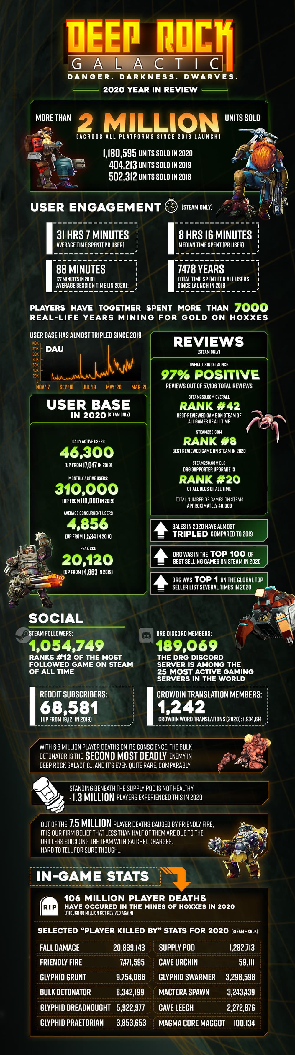 - 1180 595 копий игры было реализовано в 2020 году, когда вышла полная версия Deep Rock Galactic. В 2020 году проект вошел в сотню самых продаваемых продуктов платформы Steam и часто занимал первое место в списке продаж.