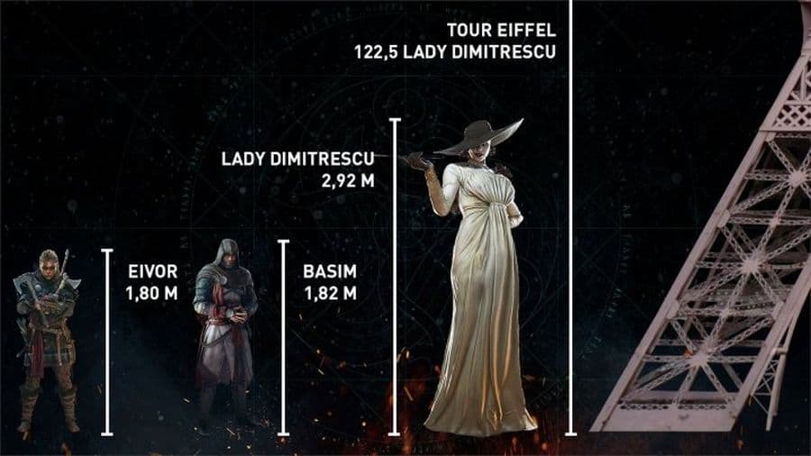 На указанный факт обратили внимание не только фанаты, но и другие разработчики. В твиттере Assassin's Creed опубликован пост, в котором леди Димитреску сравнивают с Эйвором и Басимом, героями AC: Valhalla. Из него можно узнать, что Эйвор в женском варианте (1,8 м), и Басим (1,82 м) едва достают высокой вампирше до пояса.