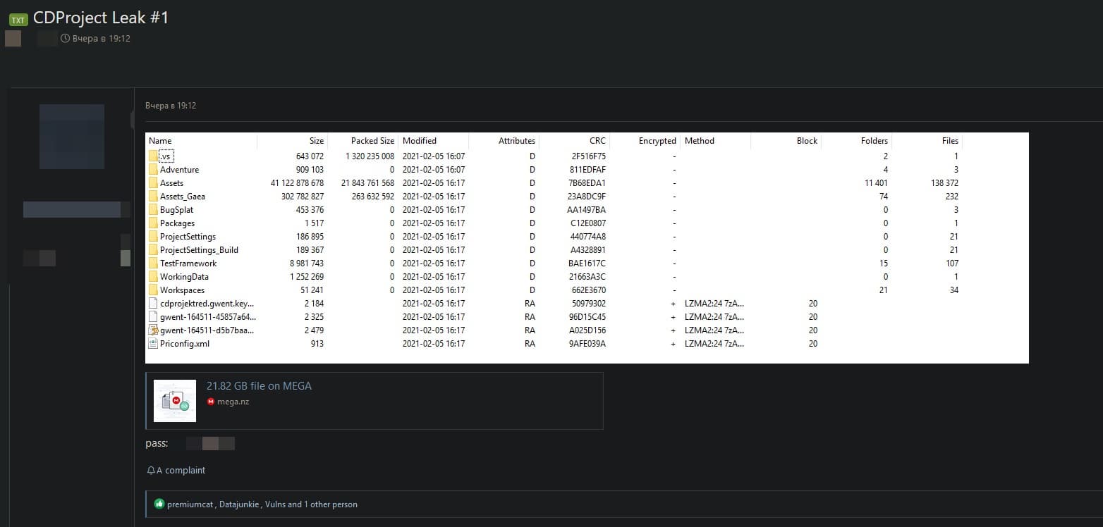 Поляки не хотят платить за украденные данные. 48-часовой лимит времени для выполнения требований преступников истек, поэтому первые файлы попали в сеть. Исходный код онлайновой карточной игры «Гвинт» размещен в интернете, но это только начало. Файлы были обозначены как «CDProject Leak # 1», и включают подробности о следующих публикациях. В файле readme.txt написано короткое «следующая доставка завтра».