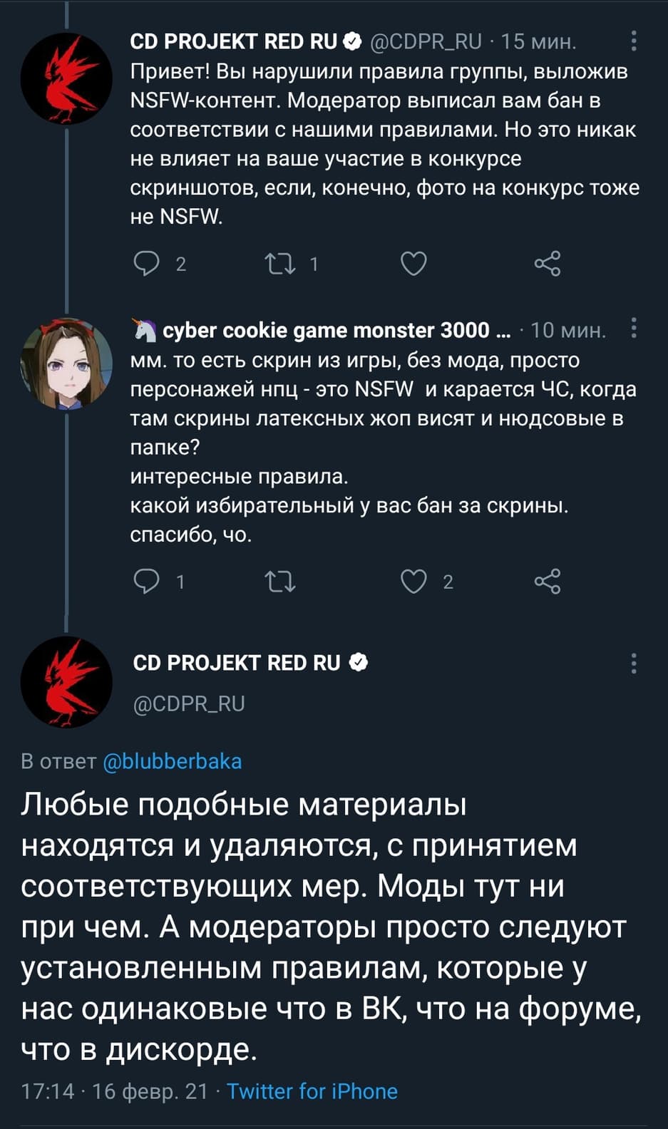 Позже представитель CD Projekt Red сказал, что Кристина выложила «NSFW-контент» (откроенный контент), а это противоречит правилам. Кристина отметила, что скриншоты были сделаны без помощи модификаций, и на них можно было увидеть лишь элементы из игры вроде различных персонажей. CD Projekt Red заявила, что «любые подобные материалы находятся и удаляются, с принятием соответствующих мер. Моды тут ни при чем. А модераторы просто следуют установленным правилам, которые у нас одинаковые что в ВК, что на форуме, что в дискорде».