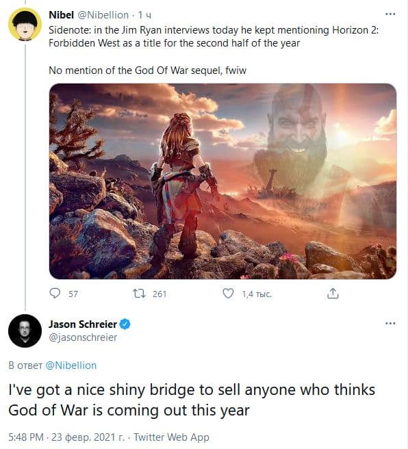 «У меня есть отличный мост на продажу всем, кто думает, что новый God of War выйдет в этом году», - написал Шрейер в твиттере.