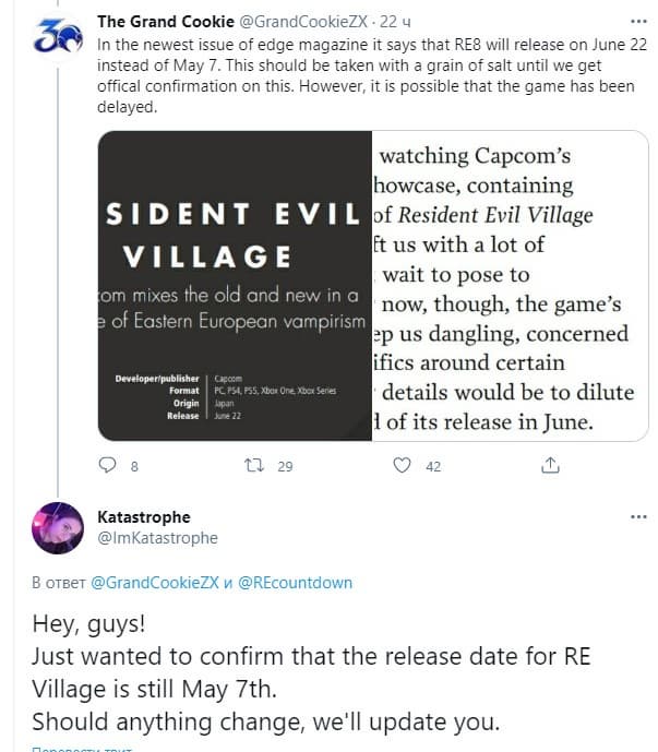 В то же время есть положительные новости о Resident Evil Village. В последнем выпуске журнала EDGE есть статья о хорроре Capcom, согласно которой проект появится в продаже только 22 июня. Вероятно, это ошибка редакции, поскольку Katastrophe (менеджер сообщества игр Resident Evil) подтвердила, что релиз состоится по плану 7 мая.