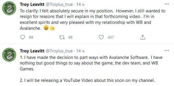 Ливитт отметил, что его должности в студии ничего не угрожало, но он решил уйти из Avalanche Software. Подробности о ситуации Трой намерен сообщить в ролике, который появится на его YouTube-канале в обозримом будущем. Ливитт подчеркнул, что он «может сказать только хорошее об игре, команде разработчиков и компании Warner. Bros Games [издатель Hogwarts Legacy]».