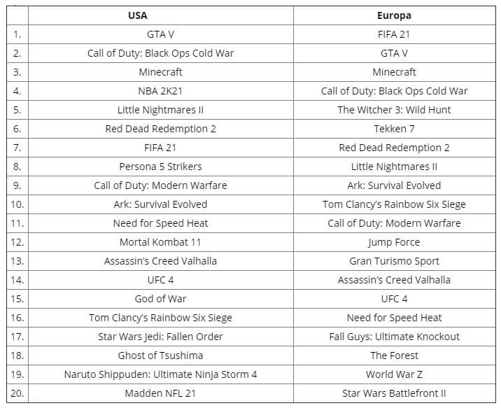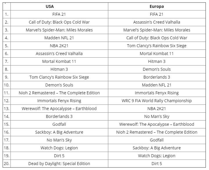 Несмотря на ограниченную доступность новой консоли, Sony сформировала рейтинг, в котором в Европе и США доминирует FIFA 21. Среди эксклюзивов – Marvel’s Spider-Man: Miles Morales на третьем месте и Demon’s Souls на десятом.