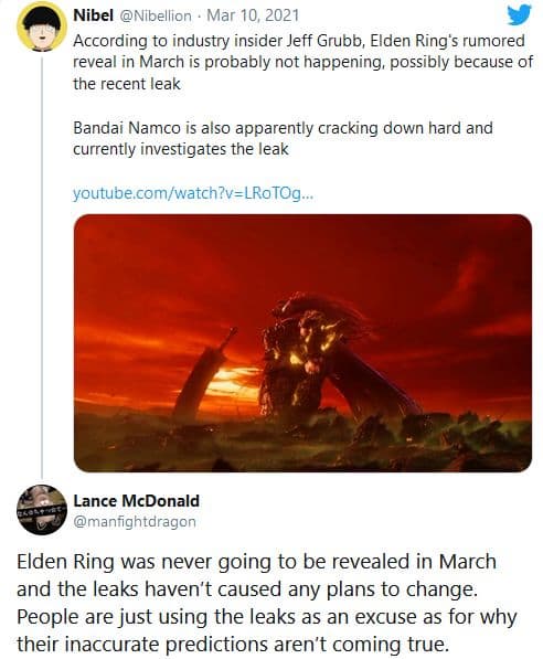 А вот энтузиаст и информатор Лэнс Макдональд заявил, что Elden Ring не собирались демонстрировать в марте этого года, поэтому утечки не могли повлиять на планы Bandai Namco.