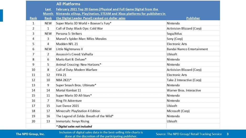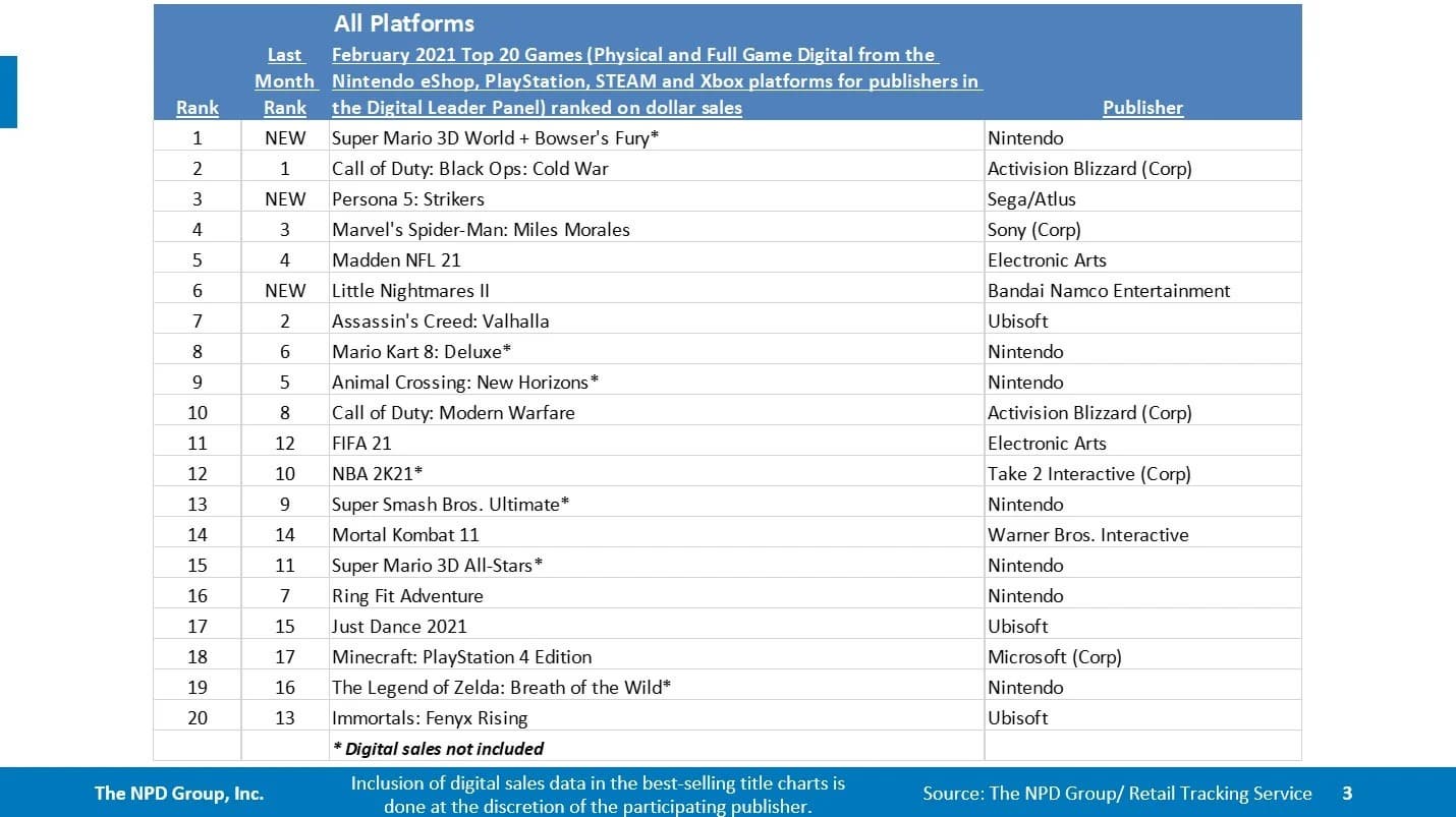 Nintendo не предоставляет информацию о цифровых продажах, но самой продаваемой игрой февраля, на основании данных на физических носителях, была Super Mario 3D World + Bowser's Fury. Это также вторая самая продаваемая игра 2021 года после Call of Duty: Black Ops Cold War. Шутер Activision опустился на 2 место в февральском чарте программного обеспечения, за ним следует Persona 5: Strikers, Marvel's Spider-Man Miles Morales и Madden NFL 21. Единственным новым игроком в топ-20 стала Little Nightmares 2 под номером 6.