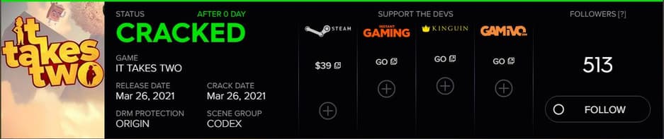 Будучи пионером в области защиты игр при помощи Denuvo, издательство Electronic Arts внезапно решило отказаться от нее в случае со сказочным платформером It Takes Two — впервые за семь лет ее использования. Результат не заставил себя ждать.