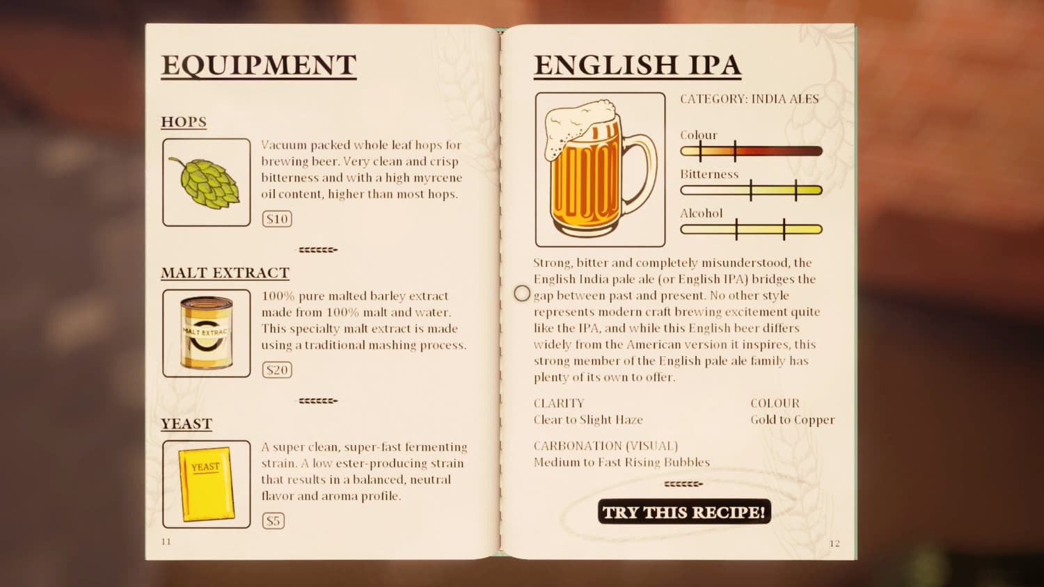 Игроки могут воспользоваться рецептами, предоставленными авторами или поэкспериментировать, смешивая разные ингредиенты. По ходу игры можно готовить различные виды алкогольных напитков, в том числе пшеничный, светлый эль, стаут и индийский светлый эль.