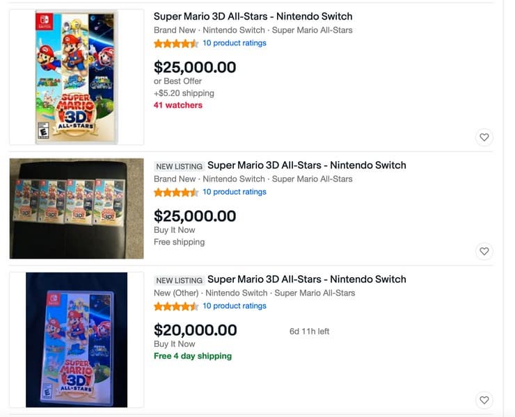 По состоянию на 31 марта три обновлённые игры о водопроводчике удалили из eShop, а магазины не получат официальных поставок картриджей. Когда спрос на продукт огромен, и он идет рука об руку с отсутствием товара к работе приступают перекупщики.