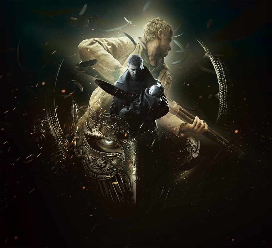 На третьем изображении демонстрируется Итан Уинтерс (протагонист Resident Evil Village) с винтовкой в руке, Крис Редфилд с младенцем и Мать Миранда в боевой маске.