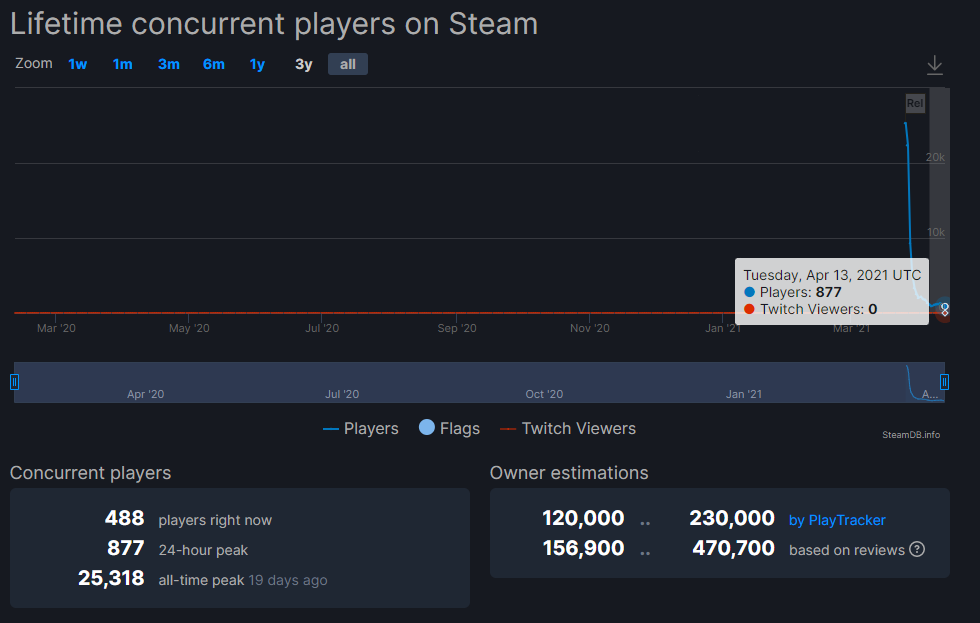 По статистике Steamdb, на момент публикации онлайн составляет 488 человек. Пиковый онлайн за сутки — 877, при рекорде в 25 318, установленном 19 дней назад.