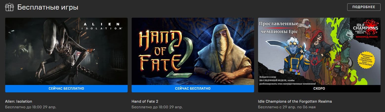 В магазине компании Epic Games стартовала бесплатная раздача боевого хоррора Alien Isolation и коллекционной карточной игры с элементами «рогалика» Hand of Fate 2. Проекты будут доступны бесплатно до 29 апреля, 18:00 по московскому времени.