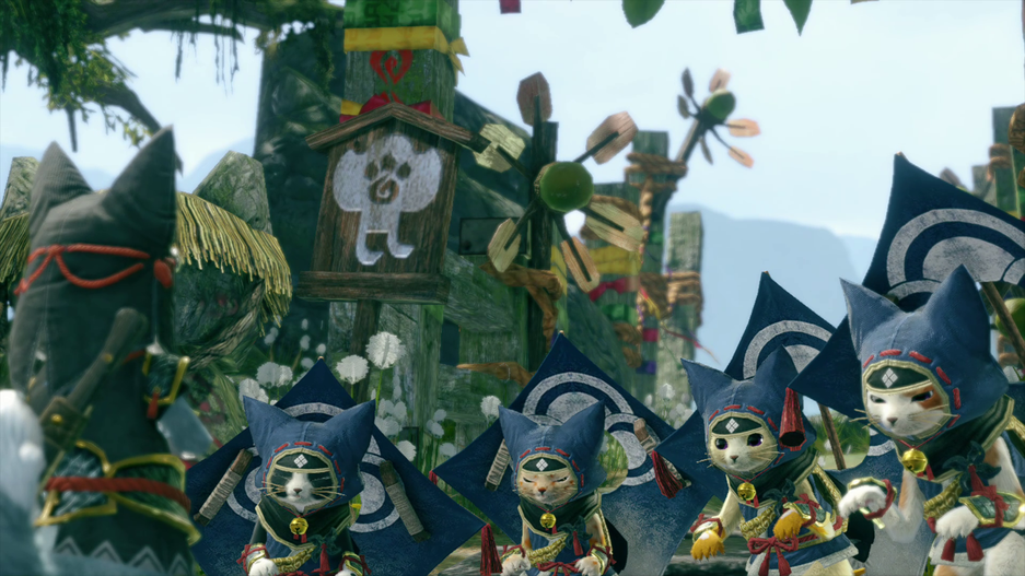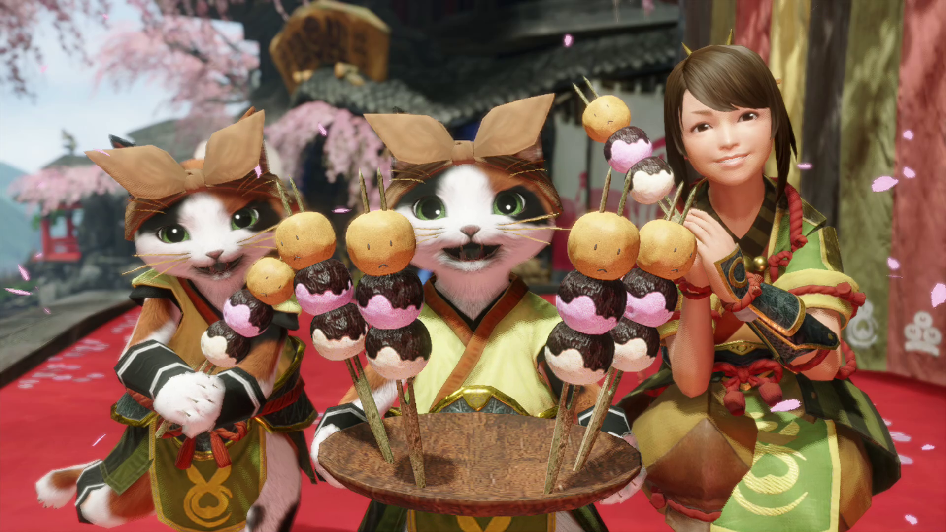 Перед экспедицией обязательно надо покушать. И готовка является одной из важнейших составляющих серии, поскольку через употребление разных блюд ты повышаешь здоровье и выносливость героя, броню и устойчивость к определенным видам атак. В Monster Hunter Rise в качестве поварят выступает смешливая девочка и котики. Делаешь заказ — наблюдаешь веселый танец и вот перед тобой тарелка с аппетитными данго.