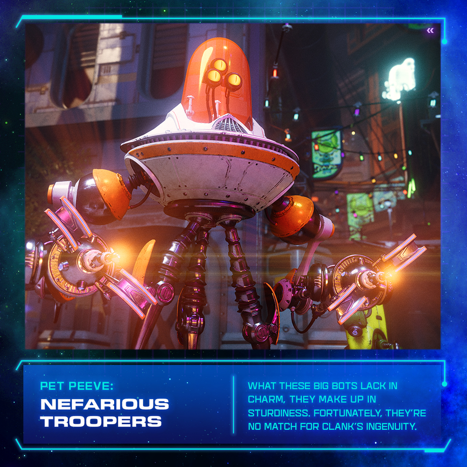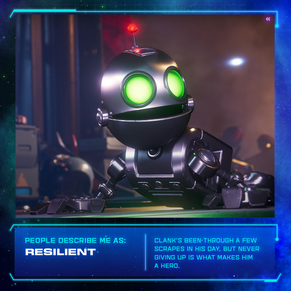 Чтобы помочь всем узнать своих героев поближе, Insomniac Games опубликовала профиль для «крошечного» главного героя грядущего эксклюзивного для PS5 проекта Ratchet and Clank: Rift Apart. Пост в Twitter включает в себя несколько новых скриншотов Кланка, которые демонстрируют его блестящее покрытие, а также знакомят пользователей с его планами на будущее, тем как Кланка описывают окружающие и что его раздражает. Карточки с фактами о персонаже содержат также скриншоты из игры. На них представлен враждебный робот, устройство Dimensionator и необычная форма Кланка.