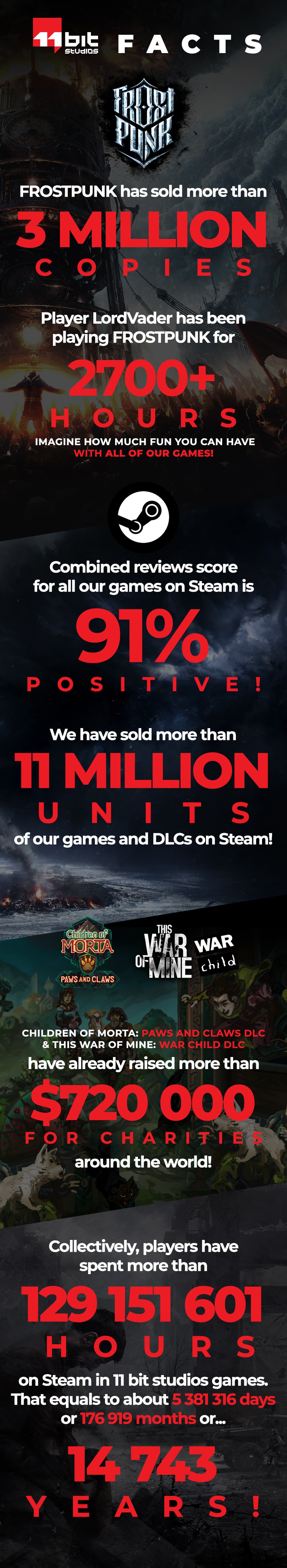 11-bit Studios явно довольна продажами беспощадного градостроительного симулятора Frostpunk. Количество проданных копий, включая DLC, перевалило за три миллиона.