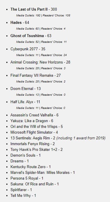 Согласно данным портала gameawards.net, в 2020 году игры 576 раз получали титул «Игра года». 300 наград (192 от журналистов и 108 от игроков) досталось The Last of Us: Part 2. Для сравнения, Hades заняла второе место и получила 64 награды, а Ghost of Tsushima – 63.