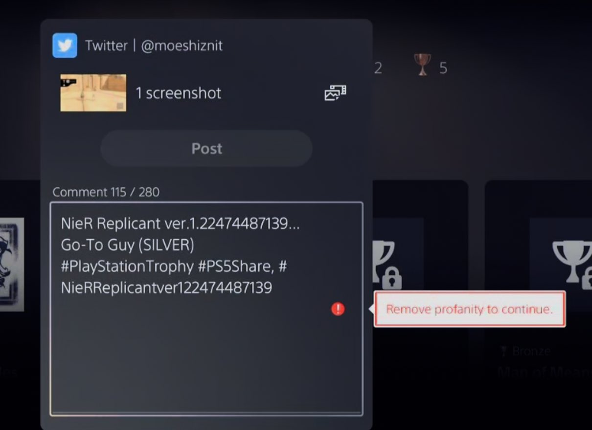 Ещё до выхода консоли PS5 было известно о том, что появится обновлённый фильтр текстов, препятствующий использованию обсценной лексики в постах в Twitter. Пользователь столкнулся с тем, что не мог отправить сообщение о выходе Nier Replicant из-за действия этого фильтра.