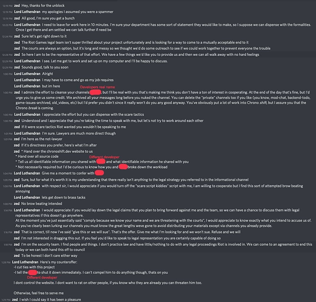 По словам одного из разработчиков Chronoshift, с ними на контакт вышел таинственный пользователь под ником zed (имя теневого ниндзя из LoL). Он представился как сотрудник службы безопасности компании Riot Games и сообщил, что юридический отдел очень обеспокоен действием команды проекта. Поначалу он действовал достаточно мирно и предложил «взаимовыгодное сотрудничество».