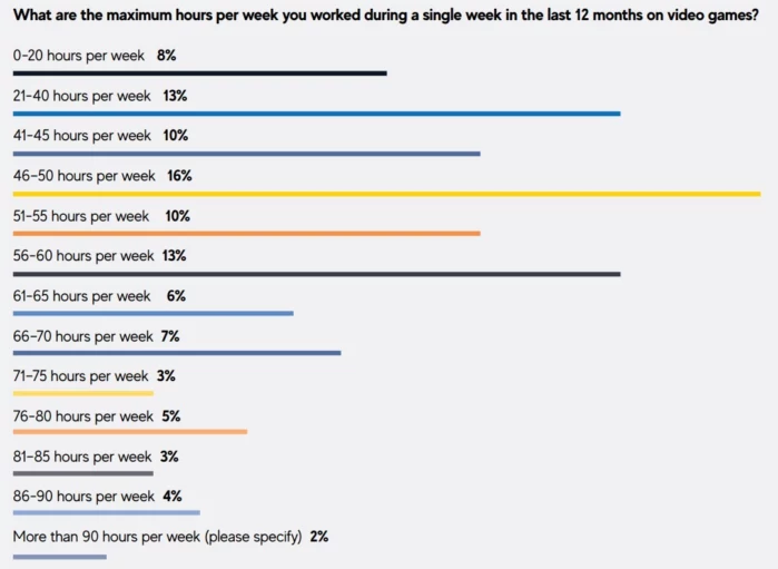- 2% поделились тем, что работали больше 90 часов в неделю. Некоторые прекращили трудиться только во время сна. Также появилась информация о том, что перед выпуском игры в релиз один из опршенных трудился более 119 часов несколько недель подряд.