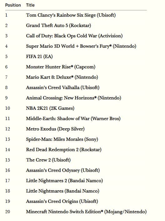 В рейтинге видеоигр доминирует Rainbow Six Siege, за ней расположились GTA 5 и Call of Duty: Black Ops Cold War.