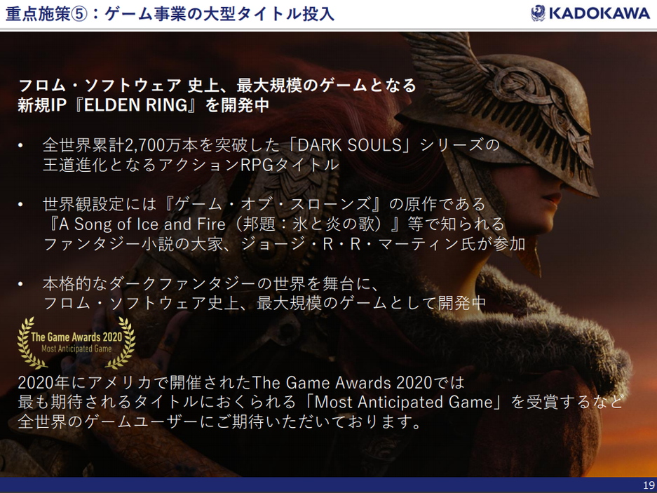 В состав игрового подразделения Kadokawa входит в том числе и студия FromSoftware. Ранее она занималась разработкой игр серии Dark Souls и Armored Core, а также Bloodborne и Sekiro. Известно, что сейчас студия занимается разработкой Elden Ring.