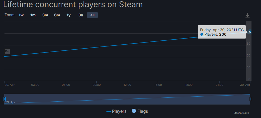 На момент публикации, пиковый онлайн составляет 206 игроков.