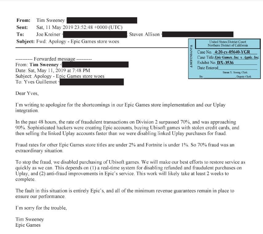 Судебное разбирательство между Epic Games и Apple продолжает раскрывать игровую индустрию с неприятной стороны. В сеть попало письмо с извинениями главы Epic Games Тима Суини перед исполнительным директором Ubisoft Ивом Гиймо за просто неприличное количество мошеннических транзакций The Division 2 в Epic Games Store, количество которых в определенный момент приблизилось к 90%. Жулики наблюдались и в других играх площадки, но число проводимых ими операций составляло в среднем 2%.