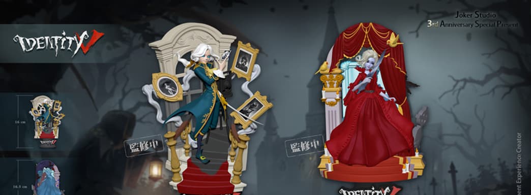Identity V — асимметричная многопользовательская игра о противостоянии Выживших и Охотников. Фигурки двух Охотников, Кровавой Королевы и Фотографа, поставляются в комплекте со стилизованными подставками. Они подчёркивают способности персонажей.