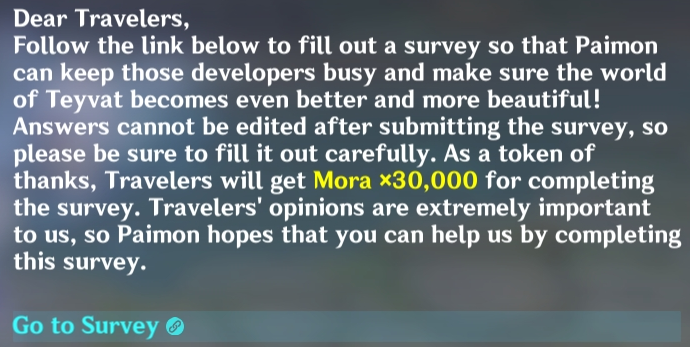 Опрос получил название «Game Character Aesthetic Preferences Survey» (опрос об эстетических предпочтениях в игровых персонажах). На внутриигровую почту игрокам поступает сообщение с предложением принять в нём участие.