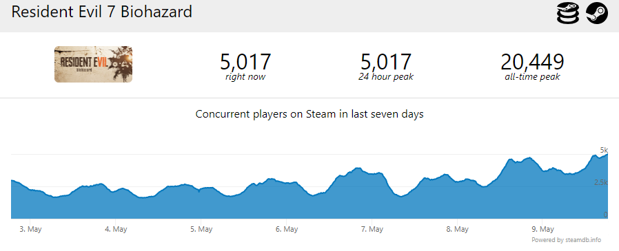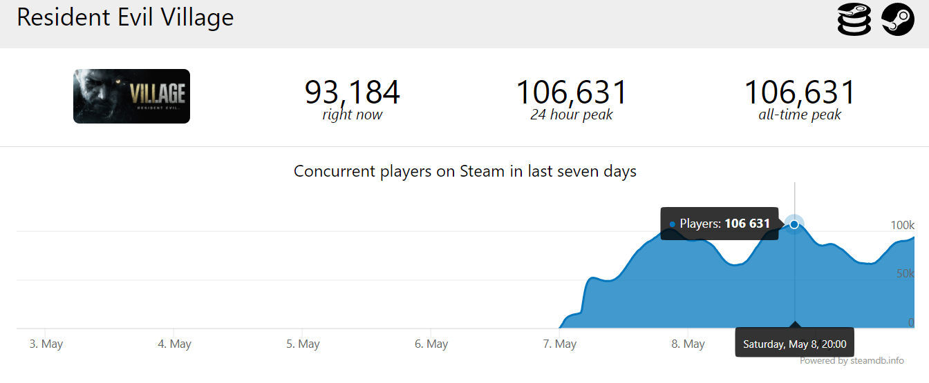 Вышедшему 7 мая хоррору Resident Evil Village удалось сначала установить, а затем обновить рекорд по пиковому онлайну в Steam для игр серии. Игра отобрала первенство у ремейка Resident Evil 2, чей рекорд составил 74 224 одновременных пользователя, собрав в пике 101 726 человек.