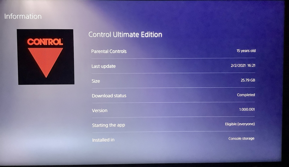 На SSD-накопителе PS5 доступно 825 ГБ. Однако, поскольку для пользователей на нём доступно только 667 ГБ, то занимаемая Control доля составляет 3,87%.