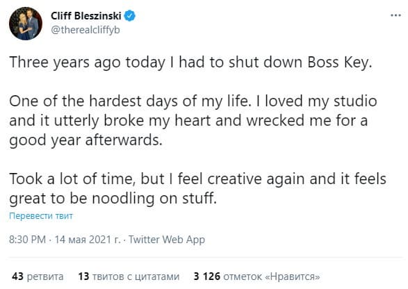 Когда в 2012 году Epic Games попрощалась с Клиффом Блезински, он создал собственную студию Boss Key Productions, но спустя четыре года вынужден был её закрыть.