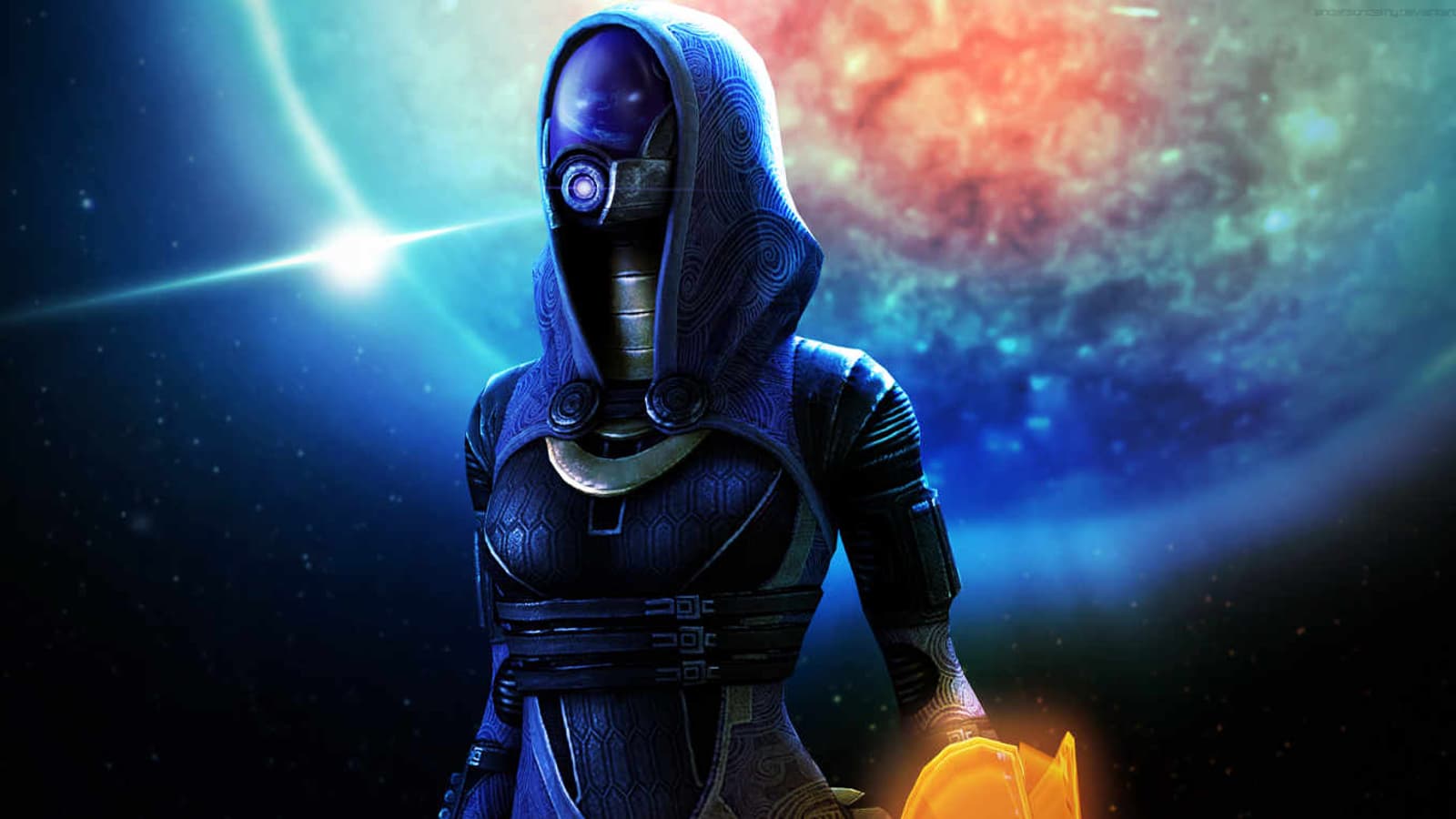 Представительница расы кварианцев Tали'Зора является одним из важных персонажей трилогии Mass Effect. Лицо девушки скрыто под шлемом. Она вынуждена носить костюм, который защищает её от вирусов и возможных болезней.