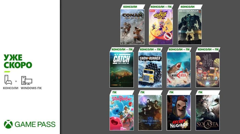 - 27 мая - Conan Exiles (Консоли, оптимизировано для Series X|S), MechWarrior 5: Mercenaries (Консоли), Slime Rancher (ПК), Solasta: Crown of the Magister (ПК) и SpellForce 3: Soul Harvest.