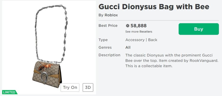 Внимание сообщества особенно привлекла бежевая сумочка с пчелиным принтом, вдохновленная настоящим продуктом из магазина Gucci. Она была доступна 17 мая всего на час за 475 Robux, или около 5,50 долларов. На YouTube появилось видео, в котором показывается, что кто-то купил её за 350 тысяч Robux, а это 4115 долларов или 302 тысячи российских рублей. Её средняя цена на рынке сейчас упала и составляет более 53 тысяч Robux – это примерно 610 долларов.