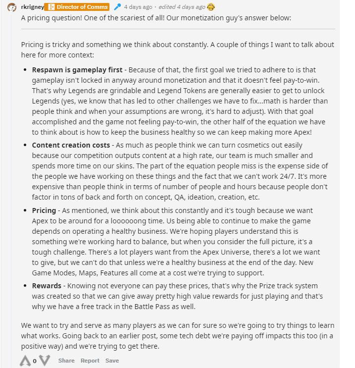 На форуме Reddit один из пользователей задал вопрос о ценообразовании предметов в игровом магазине. Ригни обратился к директору по монетизации, чтобы ответить на этот вопрос. Он рассказал, что в Respawn разделяют игровой процесс и косметические предметы, чтобы не создавать систему «плати за победу». Высокие цены связаны с разработкой и необходимостью работы множества отделов над игрой. Он также добавил, что разработчики пытаются сбалансировать высокие цены различными игровыми событиями и выдаваемыми за них наградами, а также при помощи системы боевого пропуска. Последний рекомендуется тем, кто не может позволить себе дорогие скины.