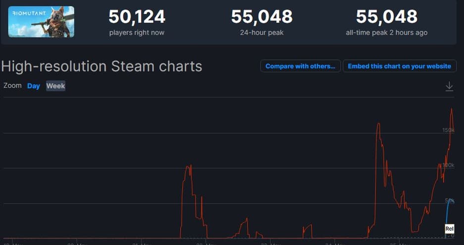 Сегодня состоялся выход Biomutant. Хотя профильная пресса не пела дифирамбы новому проекту студии Experiment 101, количество одновременно активных игроков сейчас составляет свыше 50 тысяч человек, когда максимальное количество душ в определенный момент перевалило порог в 55 тысяч. Помнится, в ту же Days Gone на старте играло немногим больше 27 тысяч человек.